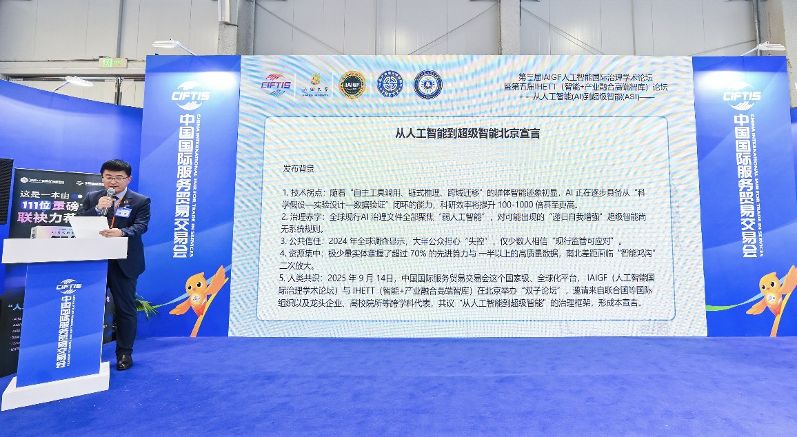 徐亭理事长在出席闭幕式环节时,正式发布《从人工智能到超级智能北京宣言》,他说: 2025 年 9 月 14日,在由WTO(世界贸易组织)、UNCTAD(联合国贸易与发展)、OECD(经济合作与发展组织)等国际组织支持的中国国际服务贸易交易会这个国家级、国际性、综合型平台, IAIGF(人工智能国际治理学术论坛)与IHETT(智能+产业融合高端智库)在北京举办“双子论坛”,邀请来自联合国等国际组织以及龙头企业、高校院所、创新主体、政府机构等跨学科、跨界别代表,共议“从人工智能到超级智能”的国际治理框架,形成本宣言。我们郑重发布《从人工智能到超级智能北京宣言》,并承诺以下六大原则(可信,可控,共治,普惠,绿色,共生)与二十项行动(涵盖基础研究与技术攻关、基础设施建设、重点场景应用、产业生态与人才建设四大领域共 20项行动)。超级智能不是下一代工具,而是下一代文明形态。它既可能把人类推向尊严与繁荣的巅峰,也可能把人类锁进不可逆的附属牢笼。选择哪条路径,取决于我们今天的共识与行动。本宣言即日起开放全球签署,欢迎各国政府、国际组织、学术机构、社会各界与企业、个人加入。让我们以北京为起点,把“可信、可控、共治、普惠、绿色、共生”的星火,扩散成照亮人类共同未来的曙光。超级智能的洪流已至,我们选择在人类命运共同体中引导它,而不是被它裹挟。